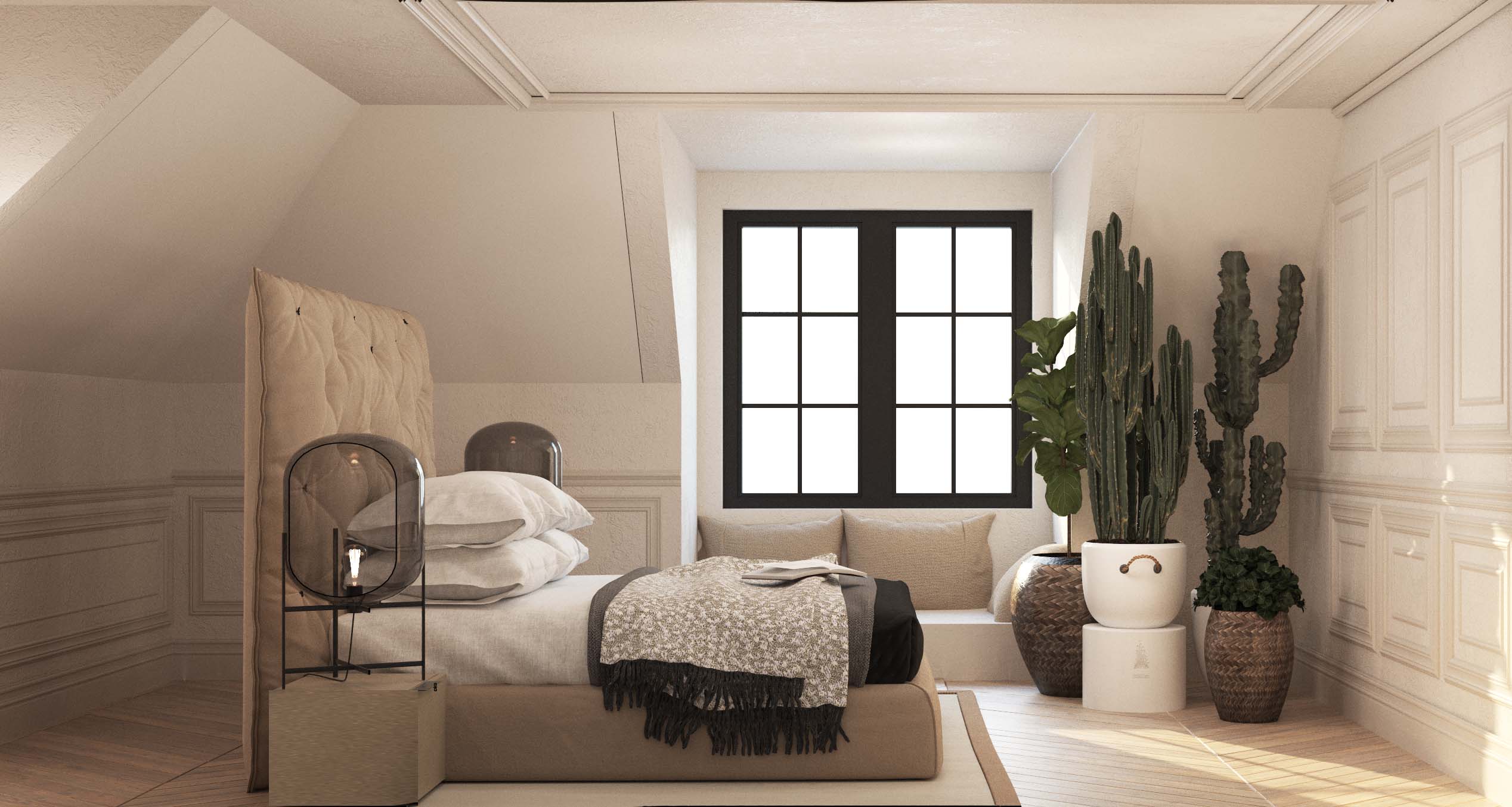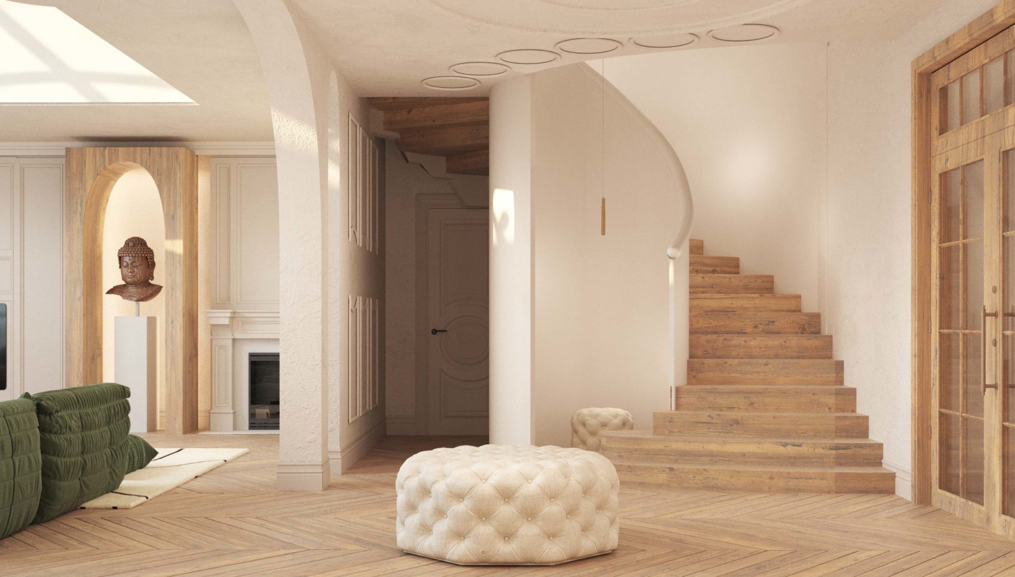 Projekt wnętrza domu to zlepek klasycznego, nowoczesnego, prowansalskiego i boho stylu. Wnętrze miało za zadanie nie tylko wypełnić ściany, ale też podkreślić kształt i oryginalny element budynku jakim jest wysokie sklepienie. Od początku budowy, wnętrze konsultowane było z architektami aby uzyskać spójny efekt. Łuki nadają elegancji i klasy, lecz czarna stolarka okienna- charakteru i nadaję kontrast jasnym wnętrzom. Sztukaterie, Drewniane łuki, frezowane drzwi, fronty kuchenne jak i podłoga w jodełkę francuską nadaje klasy i szyku. Natomiast zostały wprowadzone elementy kontrastujące jak huśtawka, zieleń, wiklina, orientalne czy industrialne dodatki. Wszystko po to, aby wnętrzu nadać domowego klimatu i lekkości.